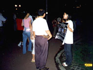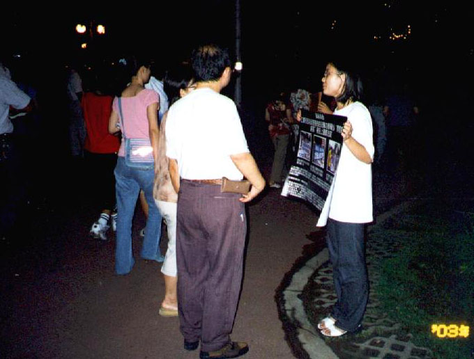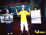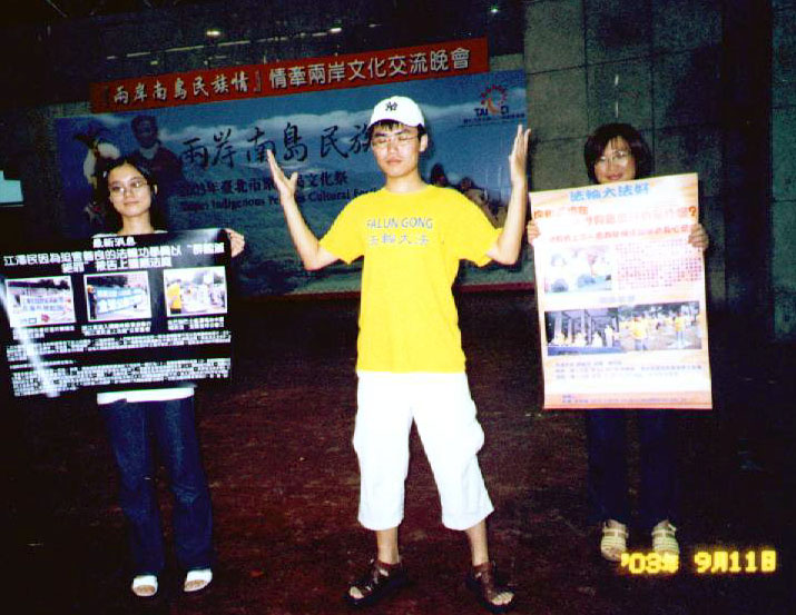 大陆歌舞团表演散场后,学员举着海报到路口等候可贵的大陆人民,一台湾民众对着我的海报说:告他(江泽民)!我明天要去大陆!一学员平静的接着说:请您告诉大陆人民真相好吗?那名台湾民众大声说:好!为了让更多的人了解真相,趁着台上台下还有一些民众,几个学员们举着海报到舞台上、舞台下拍照,更多的人清楚的看到了海报上的真相。