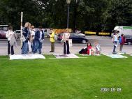 一位在总统府工作的老警察对我们说,这种形式真好,不用多说什么,江××怎么坏,人们全都知道得一清二楚了。还有一些警察主动问:法轮功究竟是什么?为什么中国要如此残酷地迫害呢?听了我们的讲解之后,他们都说:谢谢。这些警察下班后,他们又主动来索要文字资料。