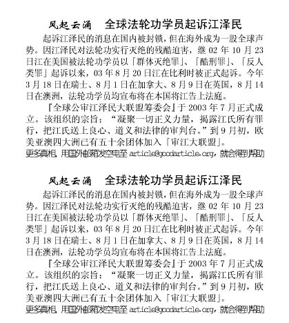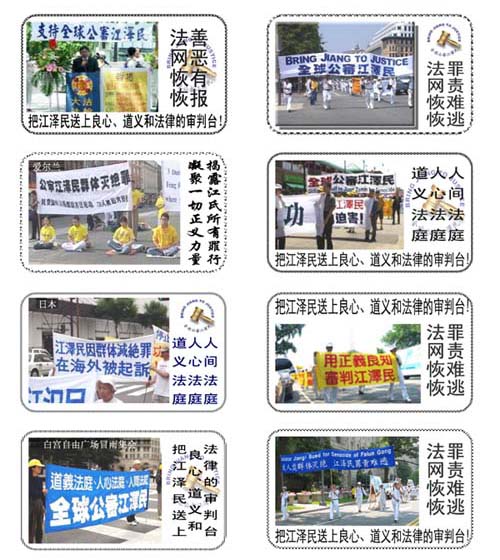 因江泽民对法轮功实行灭绝的残酷迫害,继2002年10月23日江在美国芝加哥被法轮功学员以「群体灭绝罪」、「酷刑罪」、「反人类罪」起诉以来,2003年8月20日江在比利时被正式起诉。今年3月18日在瑞士、8月1日在加拿大、8月9日在英国,8月14日在澳洲,法轮功学员均宣布将在本国将江告上法庭。