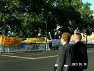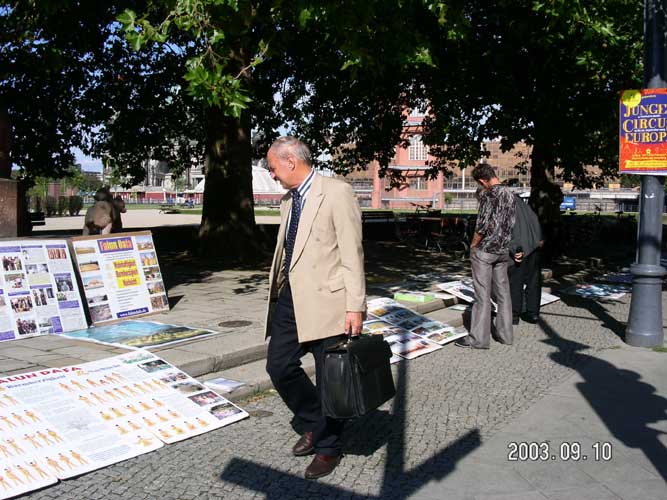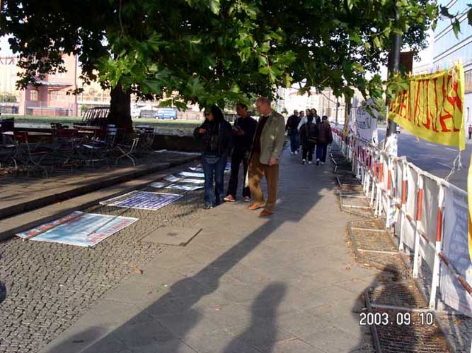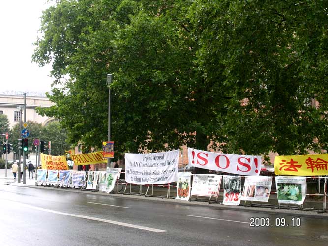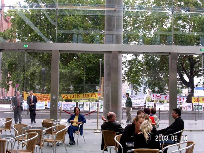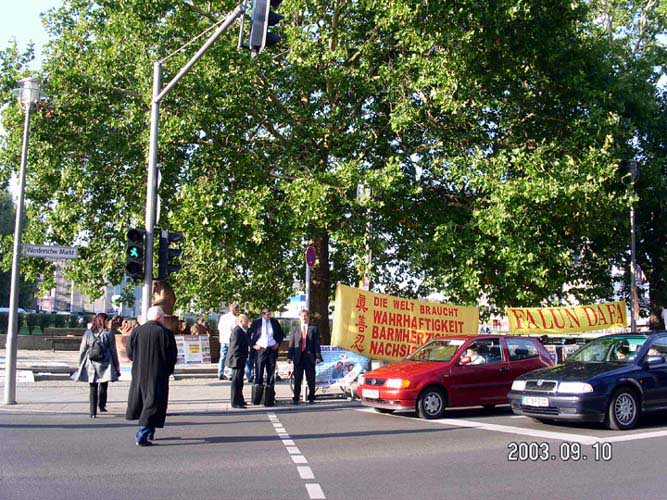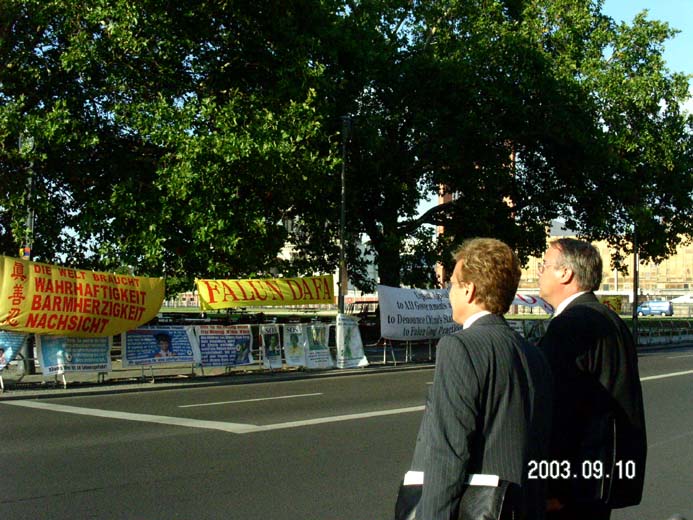 【明慧网2003年9月17日】2003年9月10日,江泽民群体灭绝罪曝光图片展在德国外交部门前举行。德国外交部中国部负责人亲自下楼接受了学员写给外长的信和德国人民的签字呼吁簿,表示一定转交给外长。