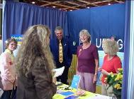 | 当地几位学员在法轮功展台边和参观者谈话 | 展厅外草地上义务教功吸引了不少人参加 |