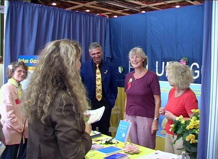 此前两天刚得到消息的法兰克福及附近其它城市的学员们也顺利地得到了一个展位,并得到允许,每隔两小时在展厅外的草地上进行义务教功。很多参观者表示了对法轮功的兴趣,每隔两小时一次的义务教功也总是能吸引不少人参加。