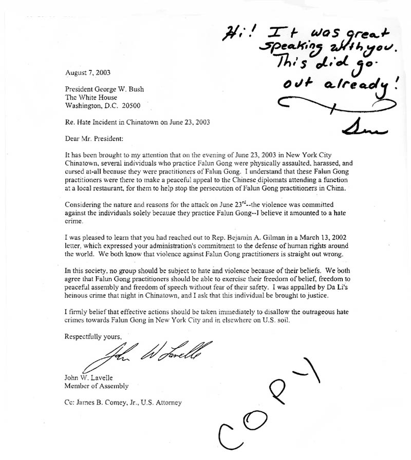 我被告知,2003年6月23日晚间在纽约市中国城,数名修炼法轮功的人士仅因为他们是法轮功学员而遭到人身攻击、骚扰及谩骂。据我所知,这些法轮功学员当时是向在当地一家餐馆举行活动的中国外交官员进行和平请愿,要求他们帮助制止对中国法轮功学员的迫害。