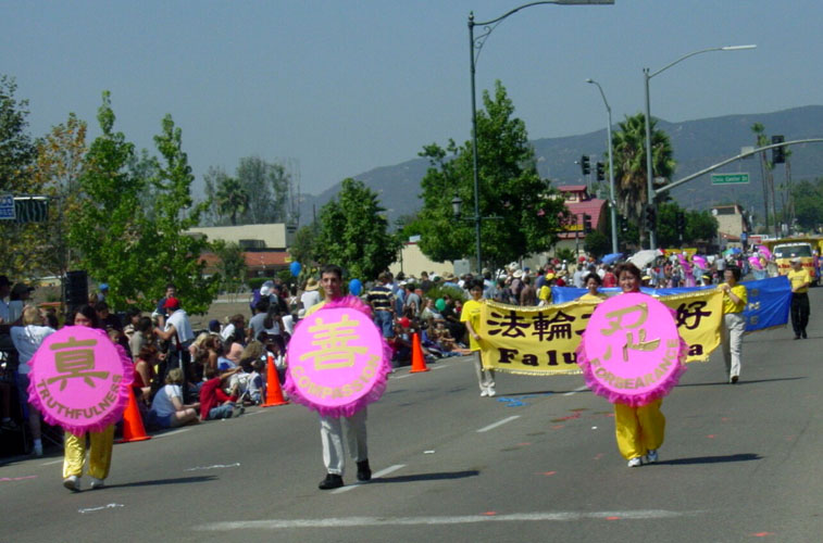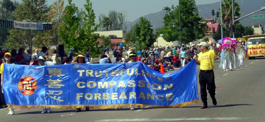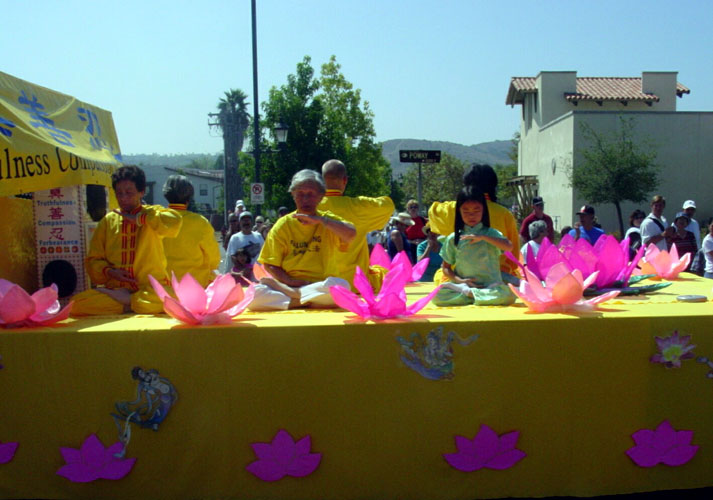 法轮功的游行队伍由三部分组成,第一部份是由身着唐装的女学员组成的舞蹈队。她们伴随着音乐翩翩起舞,向鲍威市的人民展示着中国的传统文化,令观众们耳目一新。第二部分为法轮功的游行花车。花车上“法轮大法”和“真善忍”的字样格外醒目。五位年龄不等的东西方法轮功学员坐在彩车上展示法轮功功法。他们宁静祥和的表情向人们展示着大法的美好。第三部分是由29名学员组成的刚刚成立不久的圣地亚哥腰鼓队。