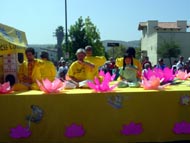 绝大部分当地观众都是首次亲自领略有悠久历史的中国传统腰鼓的风采。学员的精彩表演沿途一再受到路边观众报以的热烈掌声,而且有些观众还伴随着鼓点上下挥舞着手臂。多位在场执勤的工作人员向法轮功队伍喊着“谢谢你们,谢谢你们”。当法轮功的队伍来到主席台前时,大会主持人向观众介绍法轮大法的历史和功法,并衷心的感谢法轮功学员的参与。