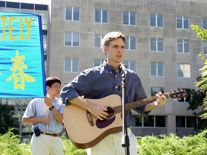 | 集会主持人加州的法轮功学员布鲁斯 | 法轮功学员陈刚谈被迫害的经历 | 加州歌手安德鲁在集会上演唱了他为李祥春创作的歌曲 |