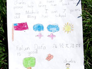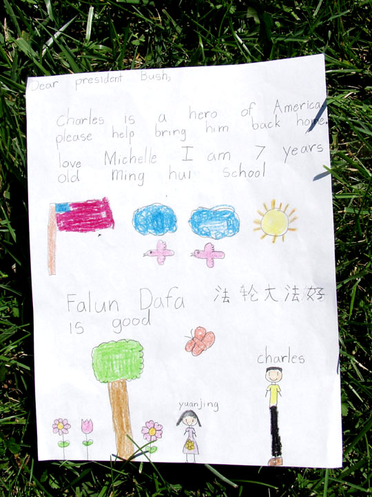 | 营救李祥春医生的展板 | 明慧学校的小朋友写给布什总统的信 | 现场采访的媒体 |