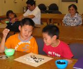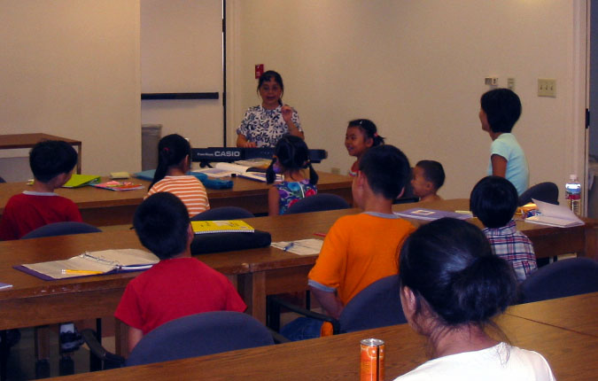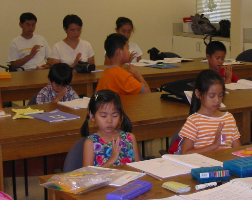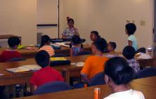 洛杉矶地区的特点是城市大、交通不便。每次大法弟子们聚会时,不少人要开车三十分钟,甚至一个多小时的时间才能到达目的地。为此,我们便决定把明慧学校上课时间适当地安排的长一些,内容丰富一些,每周六从下午二点开始上课到晚上八点结束,中间包括二十分钟的点心和休息时间。由于上课时间较长,所以我们在课程的安排上尽量做到劳逸结合,主课靠前,副课在后。主课有学法,背《洪吟》,讲故事,汉语拼音和中文等。副课有音乐、舞蹈、武术、围棋和国际象棋等,另外还有发正念和炼功。