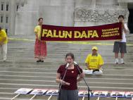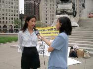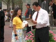 8月30日是印第安纳波利斯市举行传统的劳动节游行的日子,而市中心的战争纪念碑广场是游行的必经之路。前来观赏游行队伍的市民被优美的功法展示和展板所吸引,纷纷驻足观看并了解真相,很多人留下了支持营救的签名。参加游行的车队和人群在经过我们面前时,也减慢了速度以便看清横幅和展板的内容,并主动向路旁的学员索取资料。当他们了解到这是为了援救被迫害的美国公民时,向我们翘起了大拇指,以示支持。今年适逢印第安纳州和印第安纳波利斯市的改选年,从州长到市议员在内的各级候选人也借游行之机与大众见面,这无疑给了我们一个难得的向政府讲真相的机会。学员们向这些候选人递上大法和营救李祥春的资料,希望获得他们的理解与支持。州长候选人辛普森女士在了解真相后,当场表示了对法轮功的支持,并承诺会为早日营救李祥春出狱作出努力。曾经做过律师的州议员奥仁特利切先生 (Mr. David Orentlicher)很清楚江氏集团在中国对法轮功的迫害,他主动要求签名支持援救李祥春。在整个活动中,除了印第安纳州多位政府官员和议员的签名支持外,我们还收到了上百个来自民众的签名。这些签名都会随车队递送到华盛顿的美国国务院。