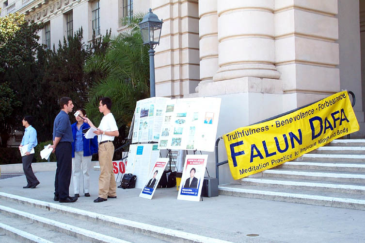 【明慧网2003年9月20日】为营救在中国被江氏集团非法关押的法轮功学员李祥春,洛杉矶法轮功学员于18日上下午分别于帕萨迪纳市与阿汉布拉市市政厅门前举行新闻发布会。帕萨迪纳市议员保尔-立图(Paul Little)给此次活动发来了支持信。在信中,他呼吁联邦政府尽一切所能,确保李医生被释放,并保证他的安全。