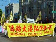 美国法轮功学员9月20日参加北加州纽瓦克市的市庆游行,由飞天舞和宫灯扇子舞组成的舞蹈队将东方文化的美好展现在西方人面前,令人耳目一新,身着黄色炼功服的炼功队,在阳光下格外的引人注目,舒缓的炼功动作时时赢来路旁观众的阵阵掌声。有不少人都是自己主动索取洪法及讲真相资料,一位中国男士说:“我以前不知道你们有这么美丽的舞蹈和服装。”
