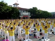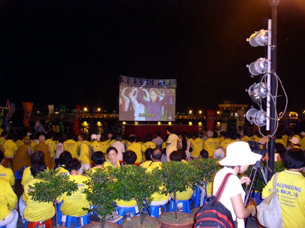 20日清早,各地法轮功学员来到澎湖县政府广场,展开千人集体炼功。炼功场面壮观、祥和,在晨光的衬托下,每个人看起来都精神饱满。接下来则举行集体学法交流,其中有二个儿童班、四个台语班,大法学员不分男女老幼,纷纷响应这次的「公审江泽民」活动。