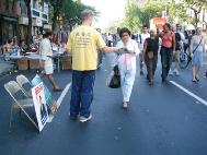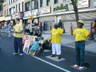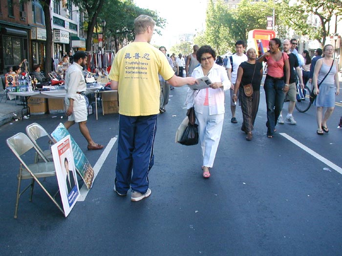 一个游客主动要求真相资料,同时告诉我们他知道法轮功。9月初法轮功参加了在布鲁克林区举办的盛大“西印度节”游行(West Indies),布鲁克林当地电视台对这次游行进行了实况转播,并至少重播了一次,法轮功在这次游行中的出色表演给观众留下了深深的印象,好评如潮。这位游客告诉我们他看了几遍游行的录像,“法轮功是最棒的!”
