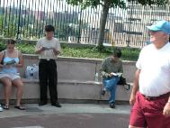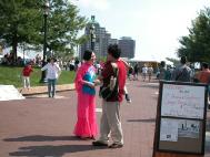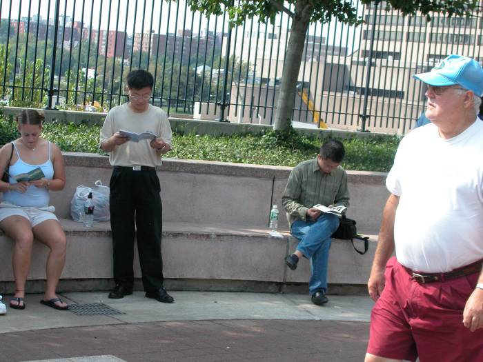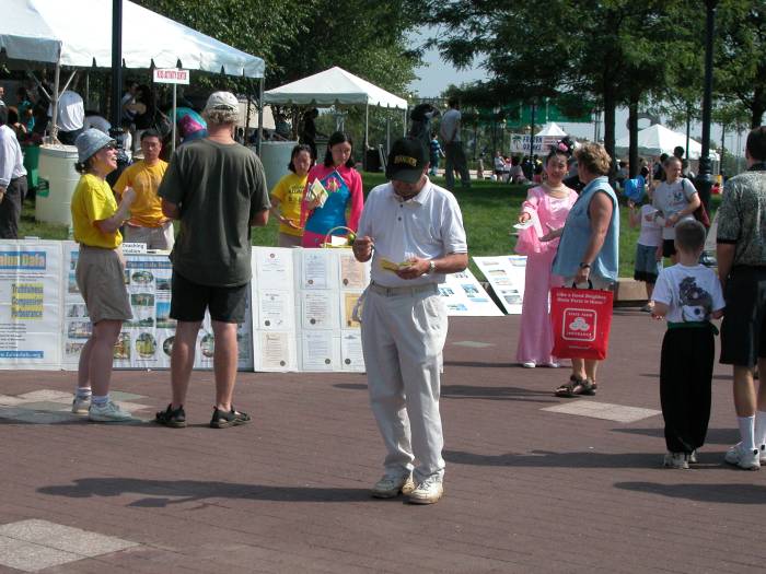 几位学员开始顶着烈日演示功法,女学员穿着色彩鲜艳的民族服装分发资料。每个经过这里的人都不禁止步,或观看展板、或接受资料、或询问炼功地点,我们带来的几千份英文和几百份中文资料不久就被分发一空。值得提出的是几乎所有的中国游客都微笑着接受了我们的资料,很多人马上就认真读了起来。学员一到这里就积极与组织者联系争取表演机会,看到学员祥和的态度、美丽的服饰,组织者马上同意给我们安排。这样,我们为观众表演了功法及舞蹈,得到了热烈欢迎。学员还与当地中文学校的舞蹈队进行了切磋,并商讨了今后的合作事宜。