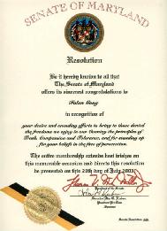 马里兰州参议院谨此宣告,向法轮功表示最衷心的祝贺。