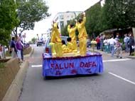 游行途中,我们的花车所经之处,观众皆被祥和宁静的大法音乐所折服,学员们的舒缓柔和的功法演示更是赢来了人们的赞叹。许多人询问如何学炼法轮功。更有一位妇女,在游行结束后,找到我们,索要详细的联络信息。