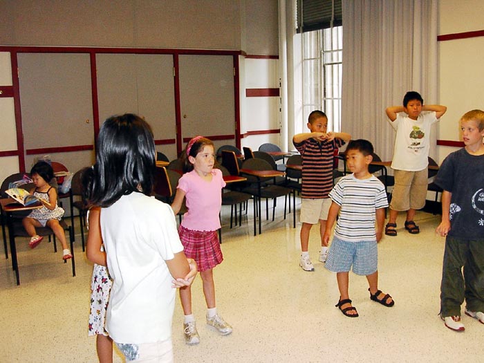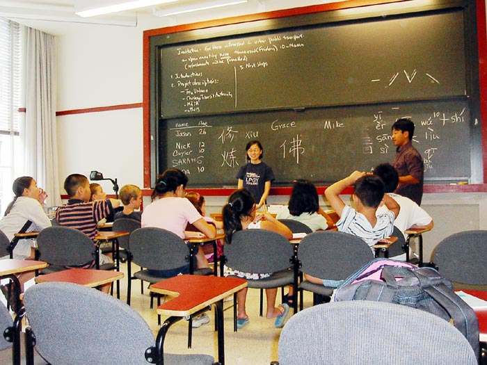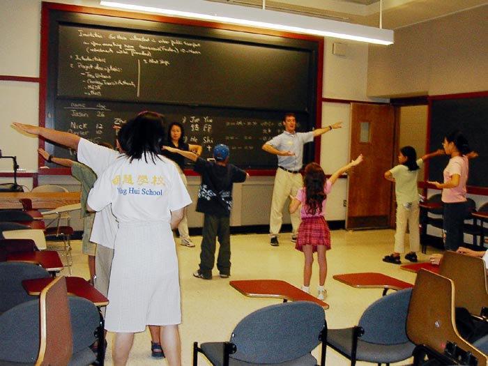 课程的安排丰富多彩,充分考虑了孩子们的特点。先教学生的5套功法,孩子们站着学了40分钟的动作还不觉得累,真是了不起。在老师的带领下,读《转法轮》,背《洪吟》,小学生们学得可认真了。接着,老师用中英两种语言绘声绘色地讲起了释迦牟尼的故事。这远古的真实故事深深打动了孩子们。孩子们从中又学会了“修炼”和“佛”这两个中文字。道德修养课老师用传统文化中的内容教导孩子有关中国古人的人生观和宇宙观。老师还教授了孩子们怎样用“心算”算数学。