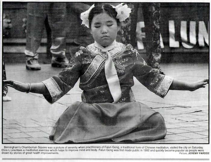 当法轮功学员于星期六访问我市时,伯明翰的张伯伦广场变成了一幅宁静的画面。法轮功是一项传统的中国的打坐修炼功法。伊莱莎-李炼习这一有助身心健康的打坐功法。法轮功于1992年开始传播于世,立即深受人们欢迎。人们为许多[修炼后]健康得到巨大改善的事迹所吸引。