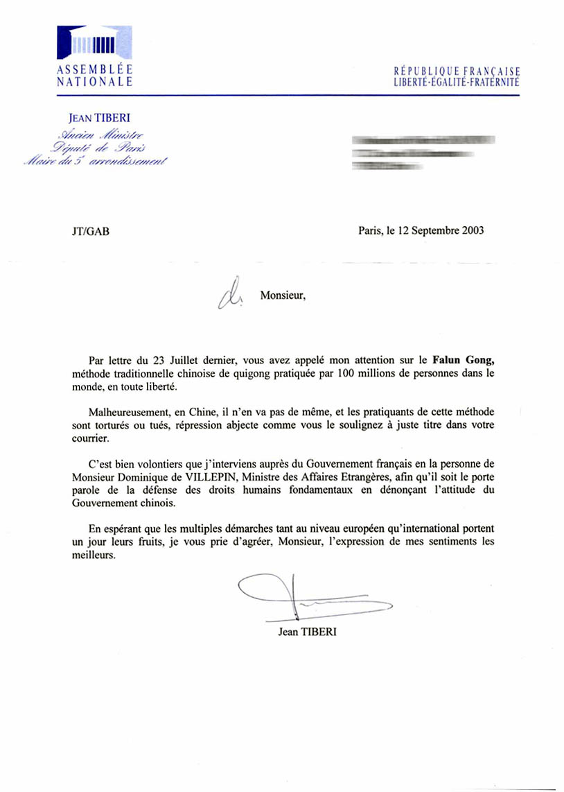我非常愿意通过外交部长多米尼克-德-维尔潘先生本人向法国政府提出干预,使其能谴责中国政府的态度,起到捍卫基本人权的发言人的作用。