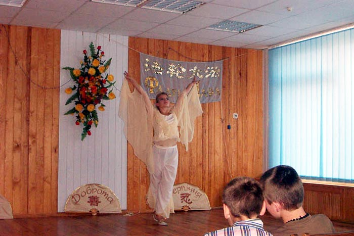 表演结束后,还给孩子们安排了问答节目,让他们讲述自己对“真、善、忍”这几个字的理解。孩子们交流了自己的认识:诚实,不骗人,说到做到;做一个善良的人,礼貌待人,相互尊重,相互帮助;有耐性,克制自己,不以恶还恶,做事不半途而废等等。