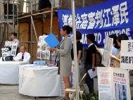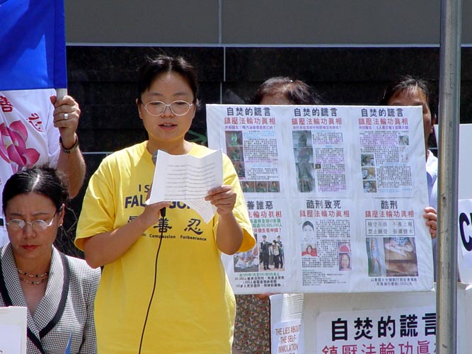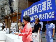 公审期间,当地几家中文媒体新!唐!人:电视台、大.纪.元;时报、世界日报等前来作了现场报道和采访。路过的行人驻足观看,与学员交谈。一个曾经邪恶对待法轮功学员的中领馆官员路过公审现场,似乎也被这种强大的正念之场所震撼,主动接受了法轮功学员的公审江泽民的真相资料。