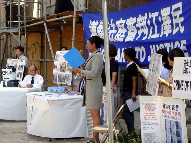 公审现场就设在中领馆门前,背景是写着“道义法庭审判江××”等的大幅横幅和公告板。整个公审过程庄严肃穆,充满强大的正义力量。三位法轮功学员分别担任法官、公诉人和被告律师,进行公诉、审讯和辩护程序。几位休斯顿法轮功学员作为受害者证人发言,控告江××残酷迫害法轮功的种种罪行。之后,一位“追查迫害法轮功国际组织”的代表出庭作证,并以录像证据说明所谓的“天安门自焚”是江氏集团一手导演的血腥栽赃案,这一伪造案企图煽动老百姓对法轮功的仇恨。最后法官宣布被告江泽民犯下的“群体灭绝罪、酷刑罪、反人类罪”证据确凿、罪行成立。并且高度赞扬了法轮功学员在这场迫害中所展现出的高贵品质和勇气。