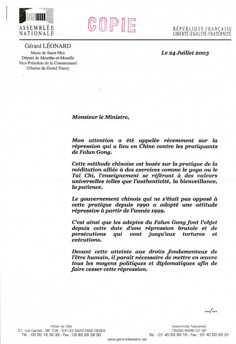 最后,我觉得有必要告知您,我担任市长的圣-马克斯市,出于对人道主义的关注,在1994年11月14日的决议后决定做培尔登-硕德龙,一位以观点罪被关押在西藏的年轻尼姑的保护人。