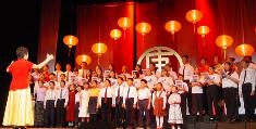 明慧中文学校的孩子们则应曾在第一百届诺贝尔和平奖颁奖仪式上表演的DAREarts少年和平合唱团邀请,一起合唱中文歌曲《梦中的虹》。