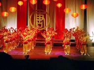 晚会一开始就由法轮功学员腰鼓队的“神雷”开场。腰鼓队身穿金黄色的中国陕北民族服饰,欢快的配乐,清脆响亮的鼓点,如一记“神雷”,在大红灯笼高挂着的舞台上表演中国传统腰鼓,热热闹闹地为来宾敲开了辞旧迎新的新一年的开始。