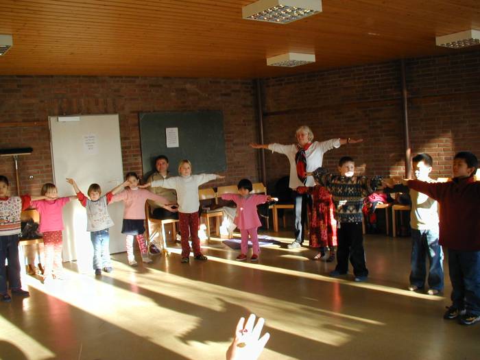 中班的孩子学叠莲花、学《洪吟》、跟专业美术老师学绘画技巧,每位小朋友都画了一幅画送给师父。小朋友们在一起炼功时,非常的认真了,谁做错了,互相之间还纠正动作,这是孩子们第一次在一起系统地学习炼功动作,他们学得特别认真,可就是两只小手难辨左右,不知该出哪只了。一位经验丰富的职业保育员,想出了在手背上贴金点的办法,到时候只要一提小金点儿,孩子们自然就会伸出该伸的手。孩子们纯真、好学和认真的劲头非常感人,一位学员激动地说:“我做了三十多年的幼儿教师,还是头一次经历这么祥和的场景,这些孩子真是不一般,我今天找到了全新的感觉。”