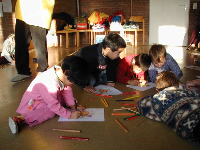 | 明慧学校的孩子们在炼功 | 明慧学校的孩子们在画法轮图形 |