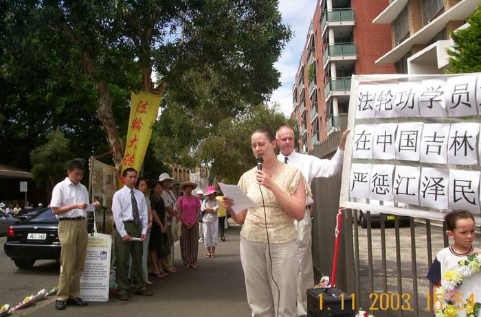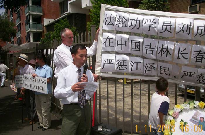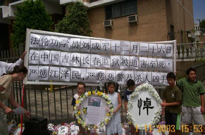2003年的最后一天的中午,悉尼的法轮功学员聚集中国驻悉尼领事馆前召开新闻发布会,悼念在圣诞节期间被迫害致死的刘成军并强烈呼吁严惩江泽民、严惩恶警及杀人凶手。
