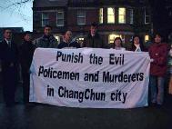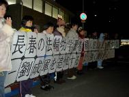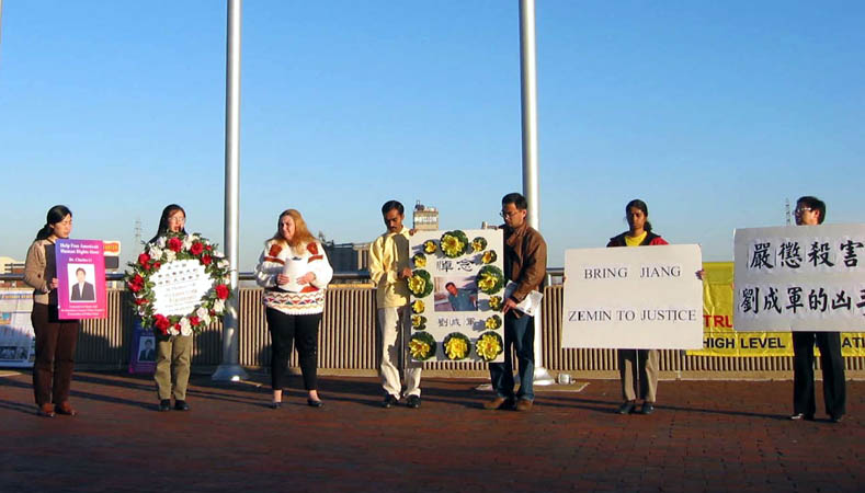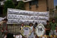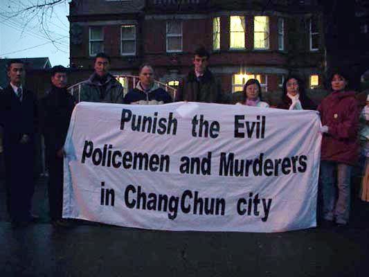新年前夕之夜,近畿法轮功学员们赶制了有关标语牌及准备了一些悼念用品,前往中国总领事馆,在总领事馆前静坐追悼刘成军,并且强烈要求严惩杀人犯主谋江泽民。