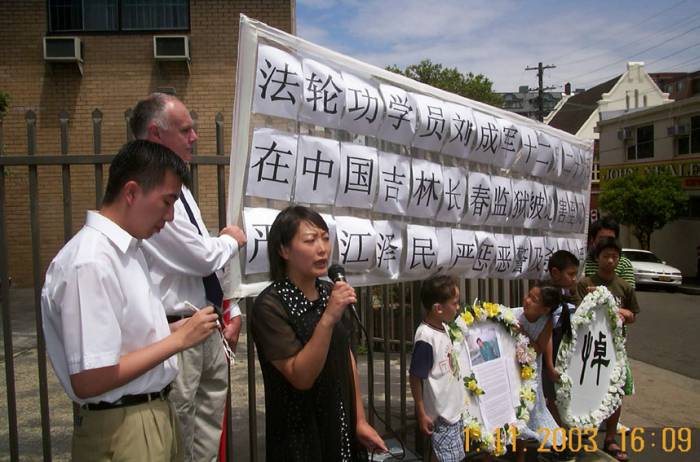 在追悼会上,发言人王女士介绍了刘成军因插播电视而被迫害致死的经过,阐明了在大陆,法轮功学员插播的合理合法性,要求严惩凶手,也呼吁世人关注千百万大陆法轮功修炼者的处境。