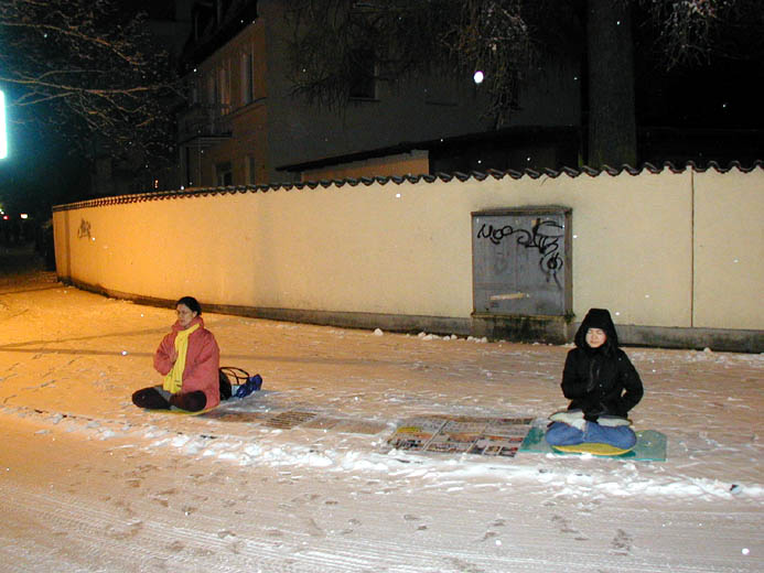 2003年的最后一天,大雪覆盖着慕尼黑,法轮功学员们冒雪来到中领馆前,悼念被迫害致死的长春大法弟子刘成军,呼吁严惩江泽民,严惩杀人凶手,进一步揭露江氏集团对法轮功学员的残酷迫害。
