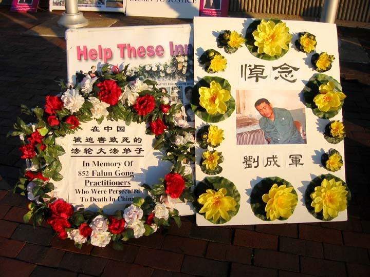 学员们为刘成军连夜赶制的挽联上写着:“正义插播传真象惊天动地,惨遭迫害离人世呼唤良知”。