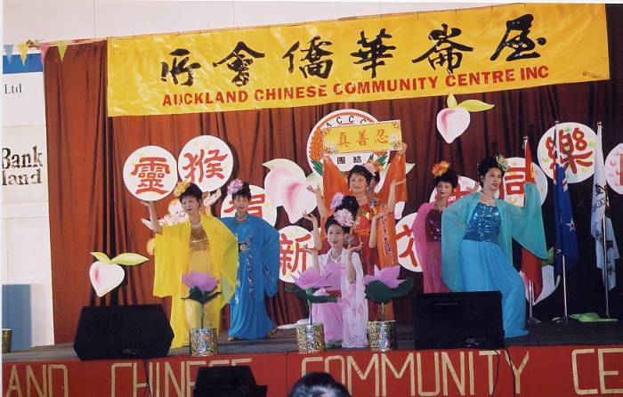 法轮功学员们在同乐会上表演了唐装舞,表演前一位学员向数百位观众说:“新西兰法轮功学员向新西兰华人问新年好!”随后表演了8人合舞及独舞,观众报以热烈的掌声,主持人当场邀请大法弟子能参加他们以后主办的活动。