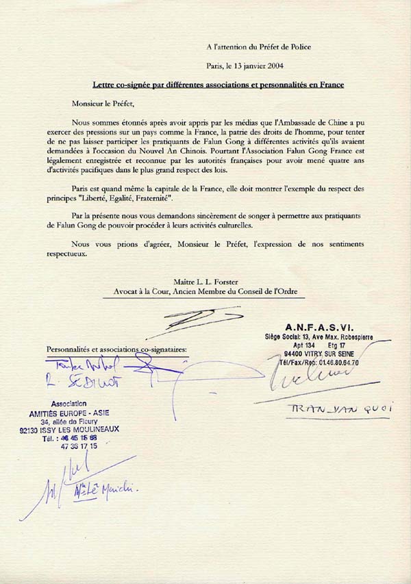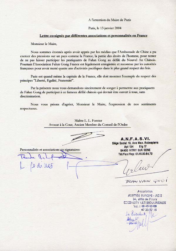 就此,法国法轮功学员起草了分别给警察总署和巴黎市政府的请愿信,呼吁社会各界鼓励、支持有关当局抵御极权压力,在捍卫“自由、平等、博爱”原则方面做出榜样;呼吁社会各界支持法轮功学员的正当权益。