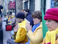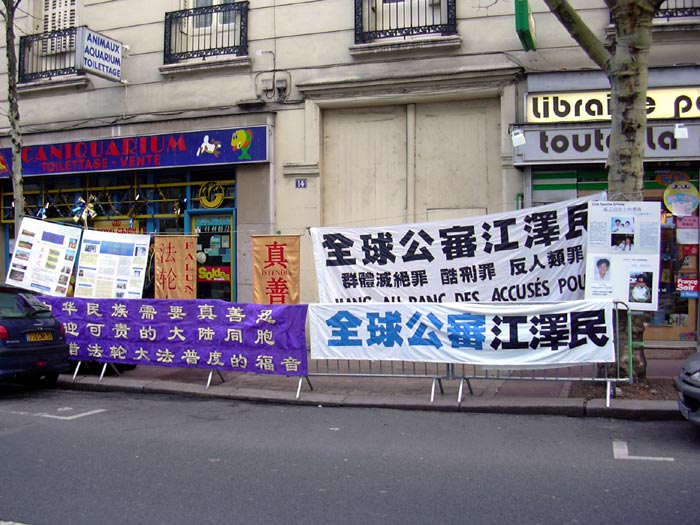 法轮功学员除呼吁社会各界鼓励、支持法轮功学员的正当权益,捍卫“自由、平等、博爱”原则外。又冒着寒冷的天气来到中国驻法总领事前抗议,要求中国停止这场由江××发动的这场对法轮功及其修炼者的迫害。