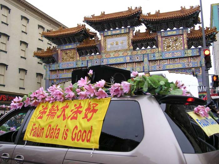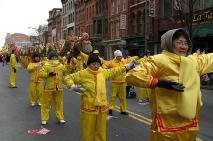 身着色彩明亮的金黄色服装的法轮功学员伴随着花车中播放的“法轮大法好”的歌声,个个精神抖擞、意气风发,并不时地停下来,演示功法。当“法轮大法”“真善忍”横幅展现在主席台前,观众报以掌声。