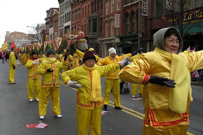 | 法轮功功法演示 | 法轮功学员组成的大舞龙队 | |