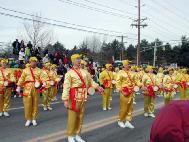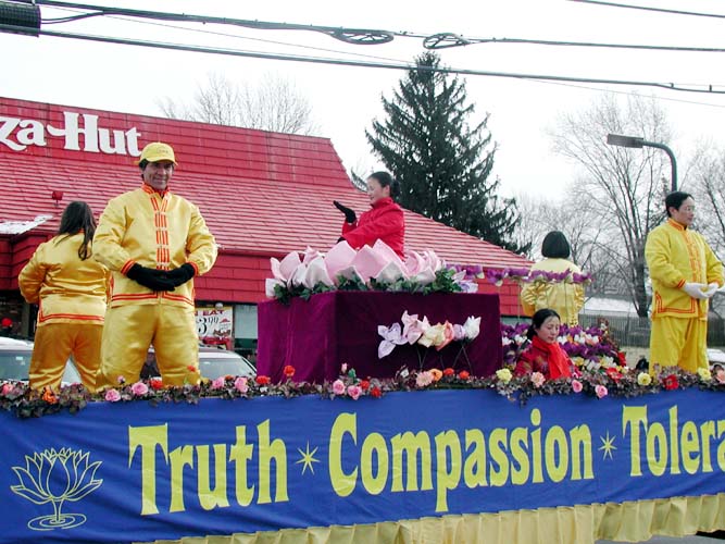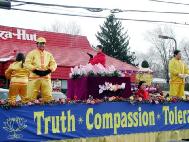 游行这天天气格外的冷,约零下10摄氏度,学员们都穿得很单薄,尤其是腰鼓队的学员,由于前两次法轮功游行队伍表现十分出色,组委会特意让法轮功的队伍压后阵。每个队伍都有数分钟的表演,因此学员在完成全行程之后,还要等候其它所有队伍表演之后,才能表演,虽然在严寒中呆的时间最长,但学员们依然精神祥和饱满,最后在观礼台前的腰鼓表演十分出色,不断博得在场官员和观众的掌声。