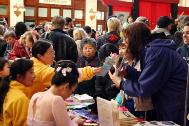 法轮大法的展位上摆放了印有“真善忍”和“法轮大法好”等的手工艺品,还有制作精美的各种语言的的VCD。和别的展位比较起来,这里的人是最多的,有不同肤色,不同种族的人们。他们排队索取学员们精心制作的莲花和各种真相材料。人们愿意和学员们深谈以进一步了解法轮大法。很多人签名要求中国政府立即释放被关押在中国的法轮功学员李祥春医生。