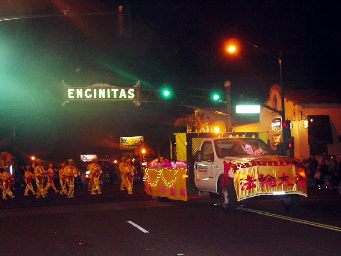 一年一度的安赛尼达市晚间节日游行别具风格,也是该市最隆重的活动之一,吸引了数万人参加。学员们为了参加这次游行作了许多精心的准备,并在参加过程中利用一切机会向人们展示大法的美好和讲清真相。在等待游行出发前的一段时间,学员们静静地在原地伴随着大法音乐炼功,场面慈悲祥和,吸引了许多人驻足观看,有的人并当场跟学员学炼起来。