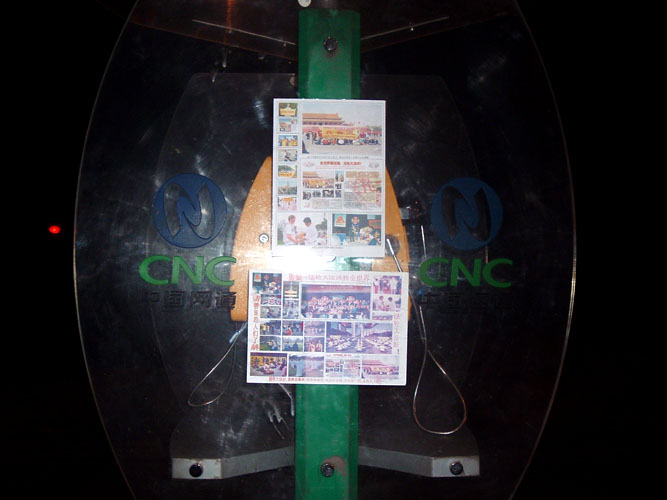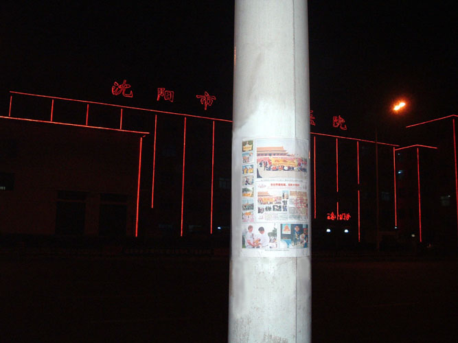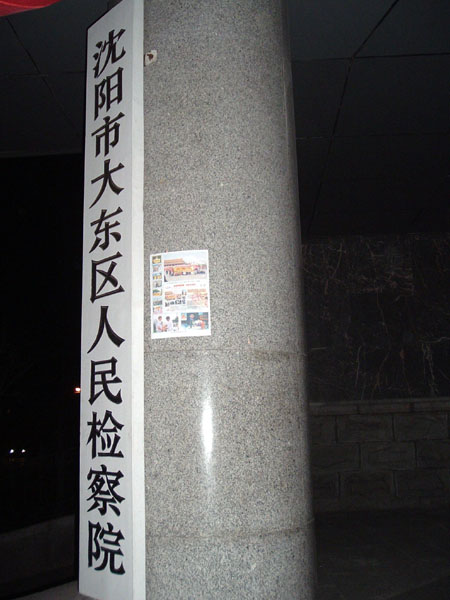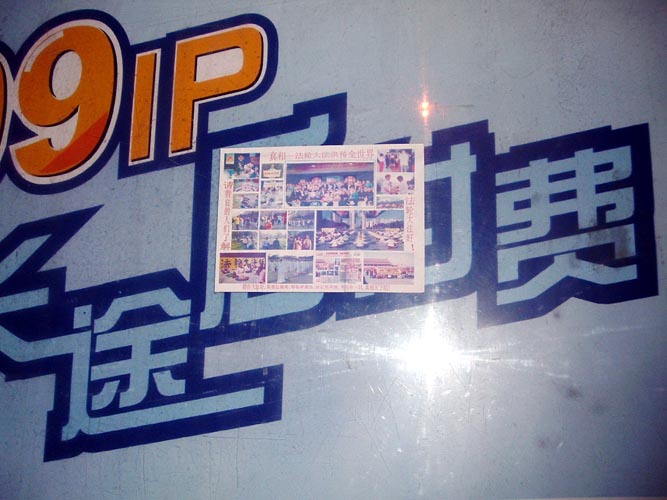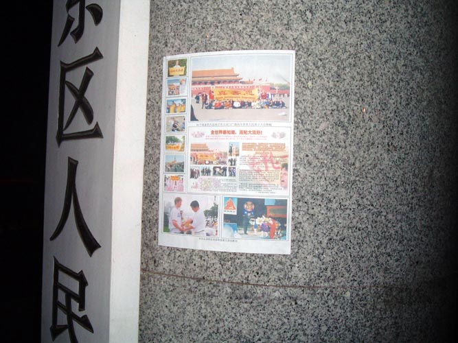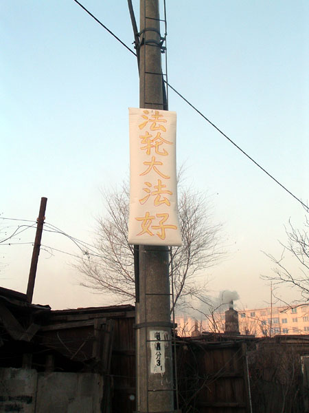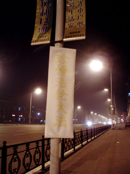 【明慧网2004年1月29日】沈阳大法弟子在除夕夜里挂出的真象条幅和海报。