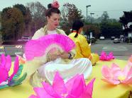 在游行的当天,许多学员很早就来到游行的出发地点,默默地装点花车和做其它的各项准备工作,同时还取得了可以在游行过程中发放资料的许可。在游行中,由花车、舞蹈队和腰鼓队组成的法轮功队伍格外引人注目,在游行沿街所设的十多个广播点不停地向观众介绍法轮功及其所获得的“色彩最鲜艳奖”。令两名发放资料的学员极其欣慰的是,人们想要了解法轮功的心非常地迫切,经常是四、五只手同时伸过来索要大法资料,令学员应接不暇。