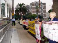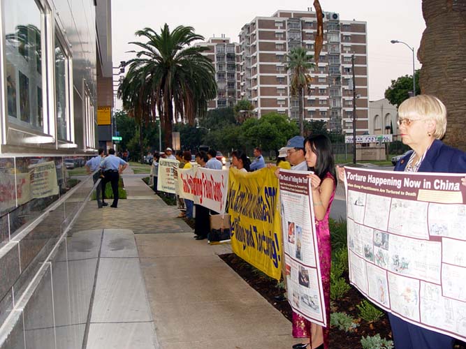 “SOS!紧急救援中国受迫害的法轮功学员”“请帮助停止迫害法轮功”“已经有1060位法轮功学员被迫害致死”等大型中英文横幅,以及中国法轮功学员遭受酷刑的展板、法轮功洪传世界的展板,等等,在中领馆前来宾们必经之路排了很长的一排。几位警察在旁边站着,学员向警察们全面的讲真象,警察们表示,他们很理解和支持学员们的行为。