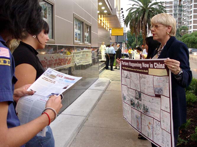 宾客们大多数是当着中领馆官员的面接法轮功学员的真象资料。当一位学员跟一位外宾讲真象时,外宾很认真的听着,中领馆的官员站在旁边很着急,企图阻止,但也无可奈何。还有一位中领馆官员搀着一位外国老太太上车,学员走上去礼貌的向老太太问好,一边说着“夫人,晚上好,请帮助停止在中国对法轮功学员的残酷迫害!”,一边递过去一份真象资料,老太太郑重的双手接过真象资料,微笑的说着“谢谢”。还有一位德州政府官员,被中领馆官员护送着走出来,当着中领馆官员的面和以前曾经认识的一位学员打招呼,并且微笑着接过学员的真象资料。