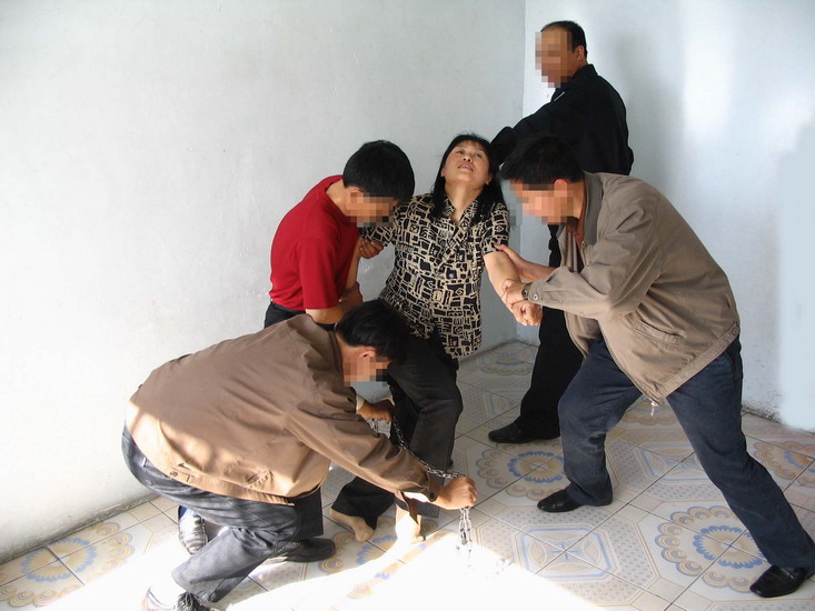 2001年6月份,我刚告诉一个犯人炼功动作,就被警察从监控器看到,恶警陈××和所长孟××打开牢门,把我强行拖出去,我拒绝犯人给我砸镣子。大队长王力过来凶狠的抓住我的头发,用力压着我的头部,我的脸几乎贴在地上,呼吸困难,头发被拽掉了几缕,我的双腿被压住,犯人给我砸链子,我被强制戴上了“猪链”。
