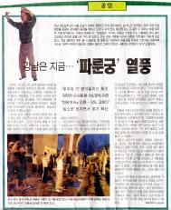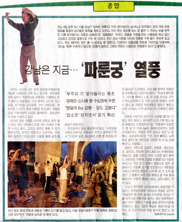 2004年10月4日下午9时许,50余名男女老少在汉城江南区良才川永东3桥下,高举双臂,在头顶抱圆。这种类似与徒手体操的姿势正是吸收宇宙能量的法轮功“法轮桩法”中的一个动作。修炼法轮功的这些人,各个都显得那么宁静而真诚。最近,在江南区人们修炼法轮功的热情日益高涨。从4月份开始,每周1、3、5晚,在永东3桥下免费教授法轮功的李贤淑女士说:“来此炼功者,人多时一天达到100多名,其间有数千人来访过。”